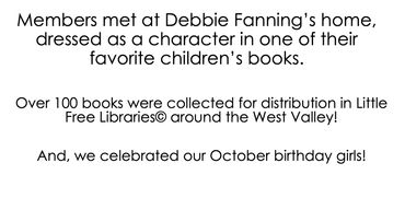 Halloween Party/Book Drive: We dress as our favorite book character -- and bring a children's book for donation to our local literacy events. Great cause, great fun!